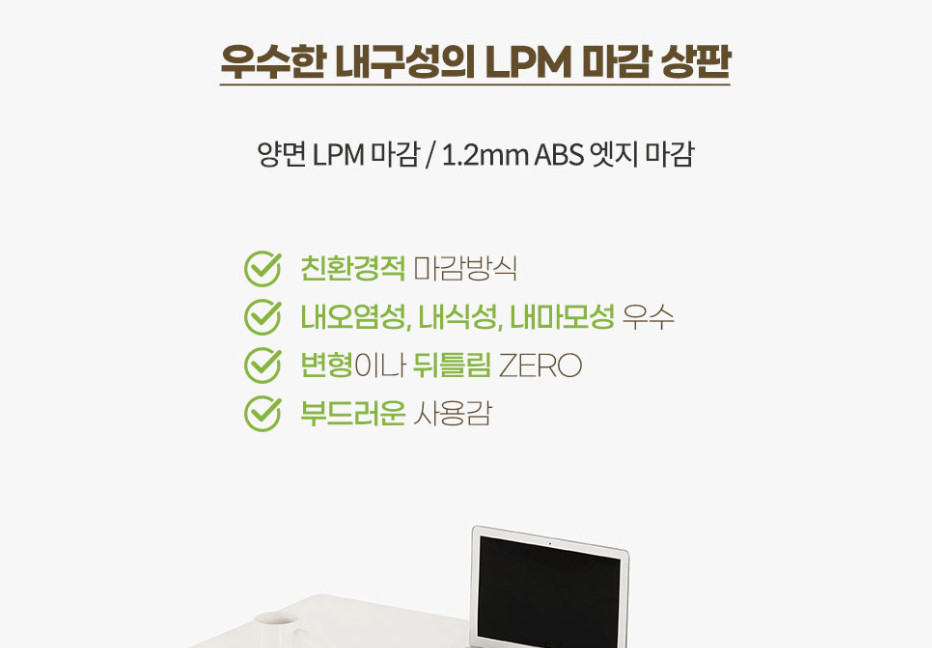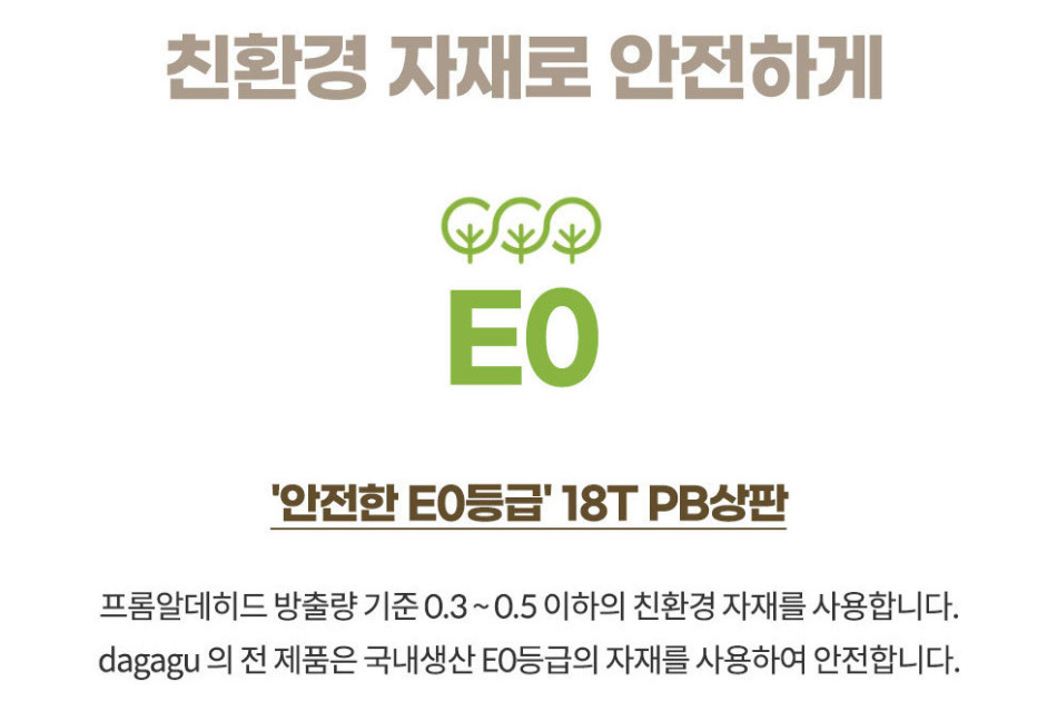 하루에도 몇시간씩 내 피부와 닿고, 최소 몇 년 이상 사용할 책상이니, 자재도 체크했습니다. 다가구 페르마타 네오 뿐만 아니라, 다가구의 제품들은 E0 등급의 자재를 사용한다고 공시되어 있습니다. 뿐만 아니라 상판 도장 마감도 상당히 만족스럽습니다. 끈적이지 않으면서도 미끄럽지 않은 느낌이며, 고급집니다.