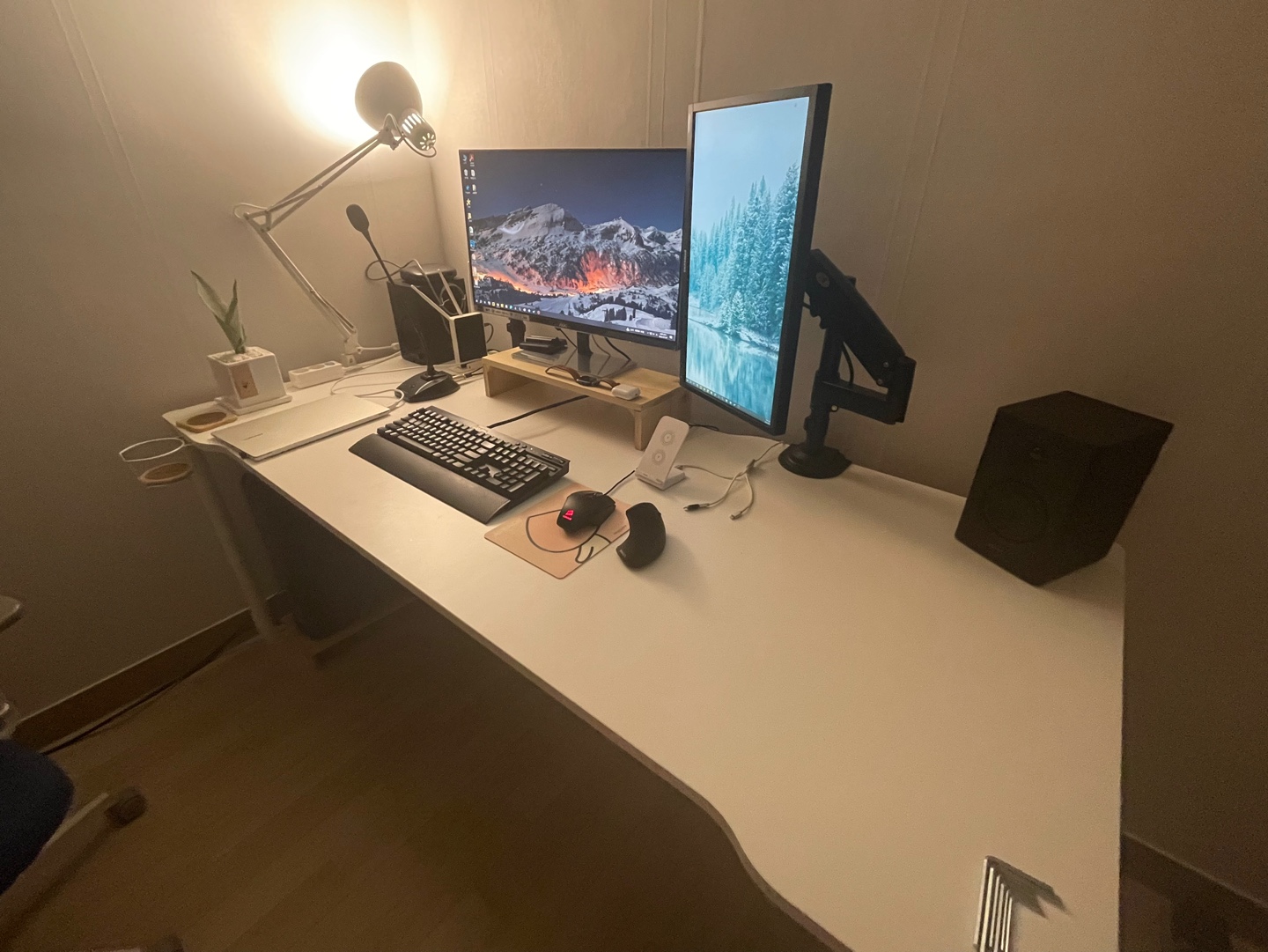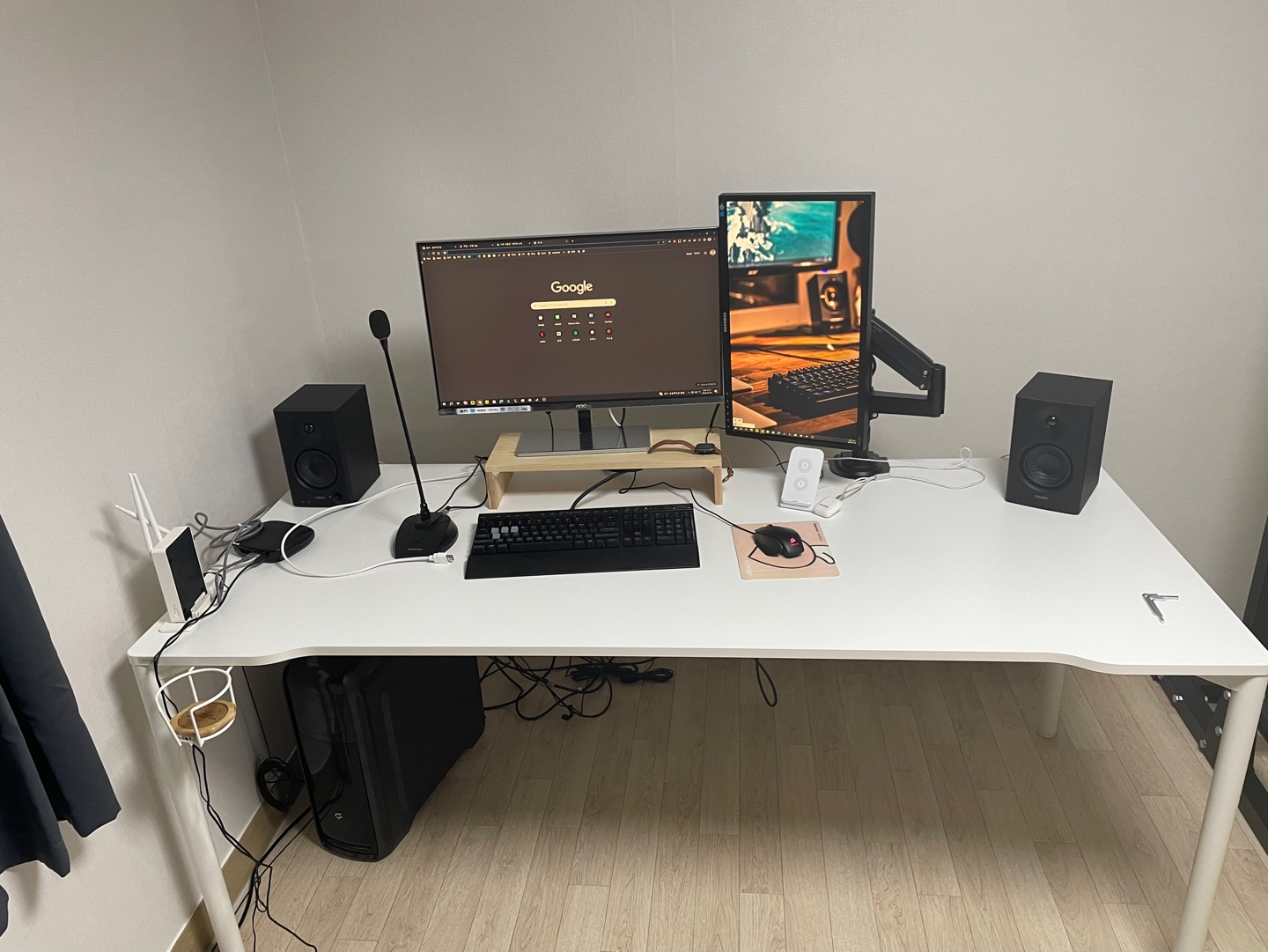 현재의 데스크 셋업입니다. 아직도 정리가 덜 끝나서 어수선하고 미완성이란 느낌이 들지만, 다가구 페르마타 책상은 앞으로의 데스크 셋업을 오랜기간 책임질 것 같습니다.