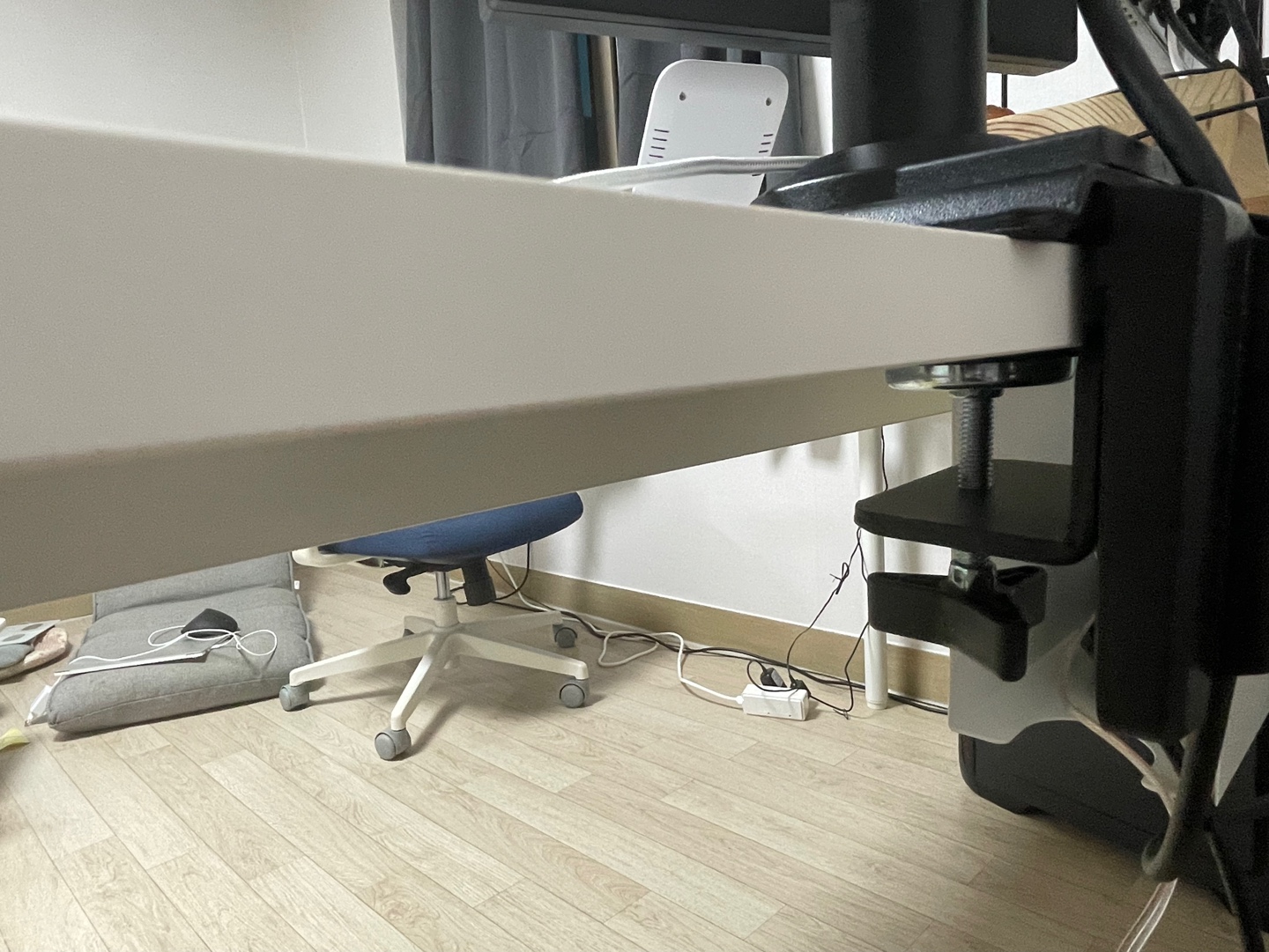 저는 듀얼모니터를 사용하고, 곧 메인 모니터를 32인치로 바꿀 예정입니다. 책상을 넓게 사용하고 싶어 모니터암을 사용할 계획이며, 이에 모니터암을 2개 이상 달아도 문제 없을 책상을 찾았습니다. 일단 다가구 페르마타 네오는 모니터암을 달기에 상당히 용이한 구조입니다. 프레임이 안쪽으로 들어가있고, 상판도 상당히 견고하니까요. 위 사진과 같이 모니터암이 상당히 견고하고 안정적으로 설치됐습니다.