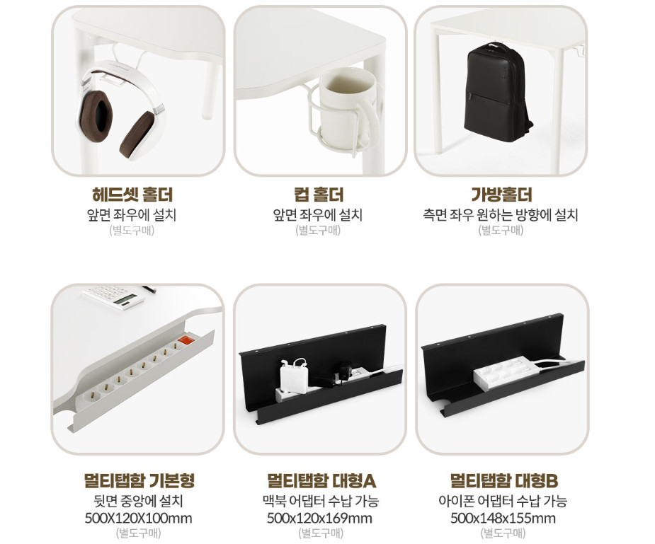 책상에 올라갈 장비가 나름 많아서, (모니터2, 스피커, 공유기, 모뎀, 마이크, 충전기, 노트북 등등..) 멀티탭, 컵받침 등의 부속 장비들을 장착할 수 있는 유틸성도 체크했습니다. 위 사진을 보시면 상판 하부에 부속품을 장착할 수 있는 홀이 정말 많이 준비되어 있고, 부속품도 별도 구매할 수 있습니다. 멀티탭함이나 컵 홀더는 구매하시면 좋을 것 같습니다.